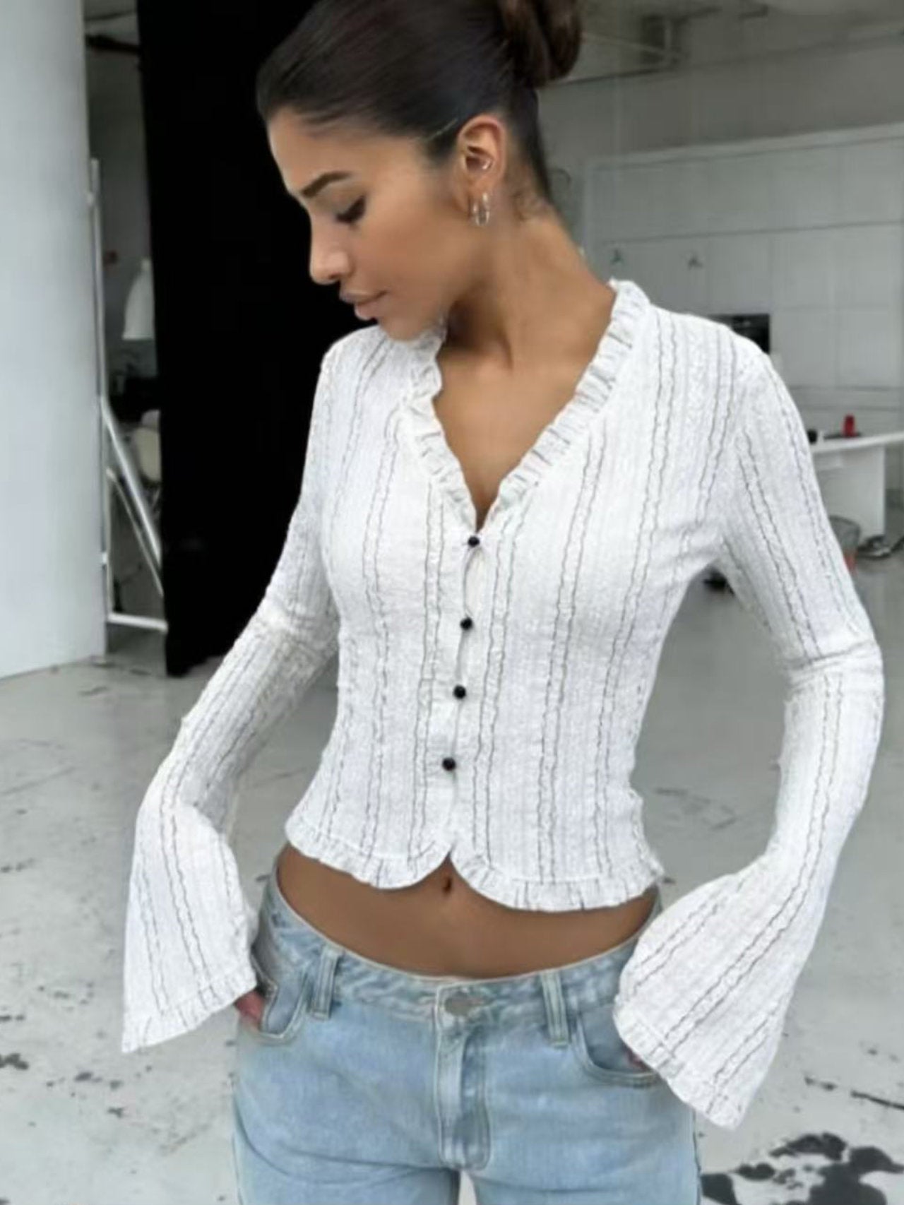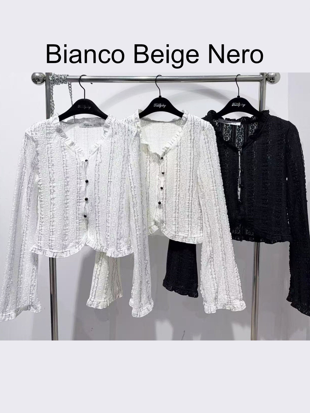 - Trasforma il tuo look con questa elegante camicetta in pizzo ondulato, confezionata in tessuto elasticizzato che abbraccia le forme e vanta polsi svasati per uno stile contemporaneo e rilassato.