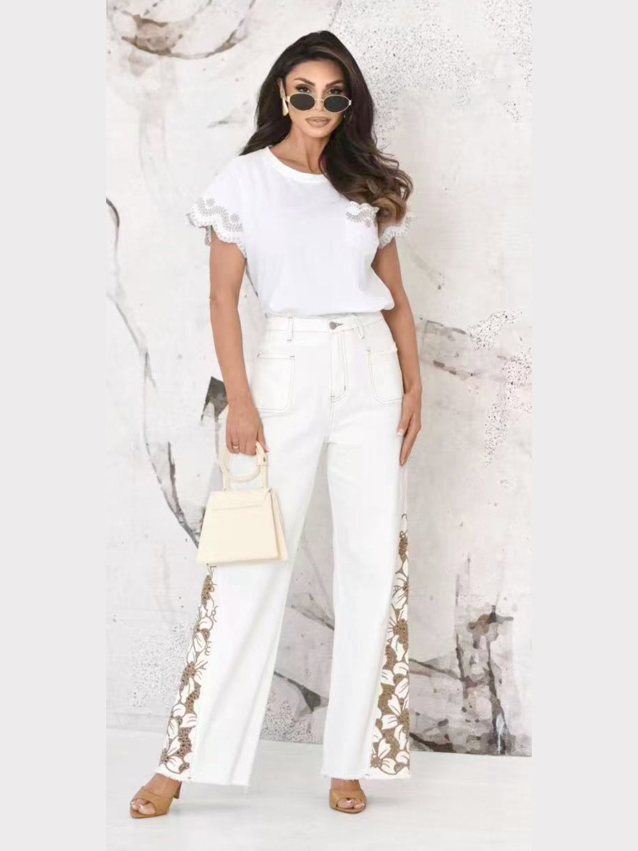 - Jeans a palazzo con ricamo in pizzo macramè che trasforma il tuo stile con un tocco di eleganza. Un capo distintivo e raffinato per chi ama brillare con personalità autentica e carattere tutto suo.