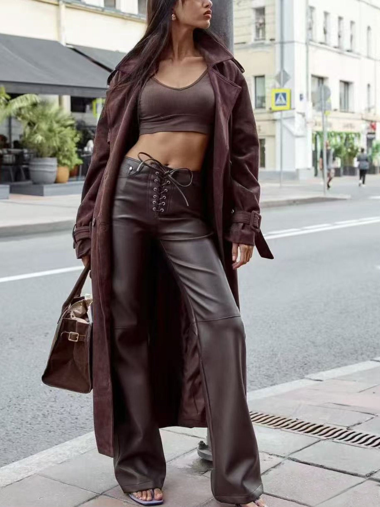 - Questi pantaloni a zampa in ecopelle sono il tuo nuovo alleato per un look che non passa inosservato. Con i lacci come dettaglio di chiusura, catturano quella giusta dose di glamour senza rinunciare alla comodità casual. Indossali quando vuoi fare colpo con stile spensierato e un pizzico di atteggiamento.