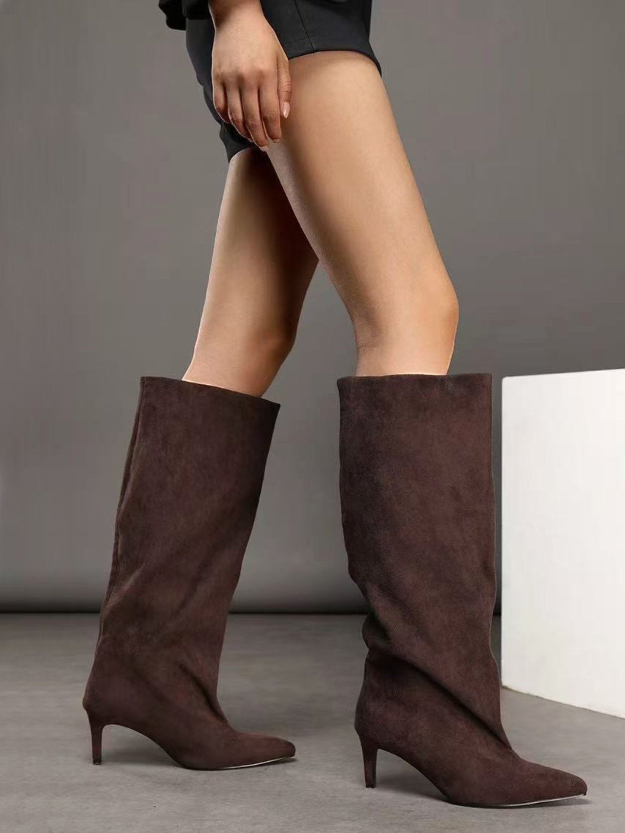 Stivali scamosciati con gambale morbido e tacchetto elegante. Comfort e stile in un'unica scelta che valorizza la tua figura con naturalezza.