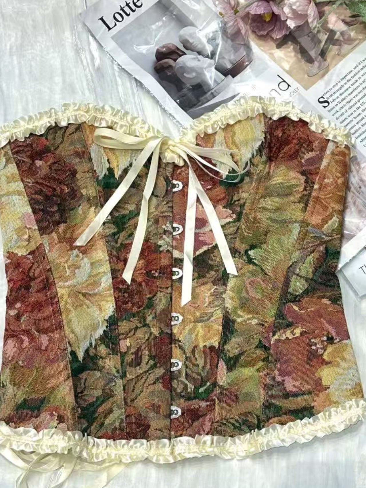 - Top a corpetto con stampa floreale e gancetti frontali. La linea a fascia dona un look impeccabile e sofisticato. Ideale per chi cerca uno stile chic e raffinato senza rinunciare a nulla.