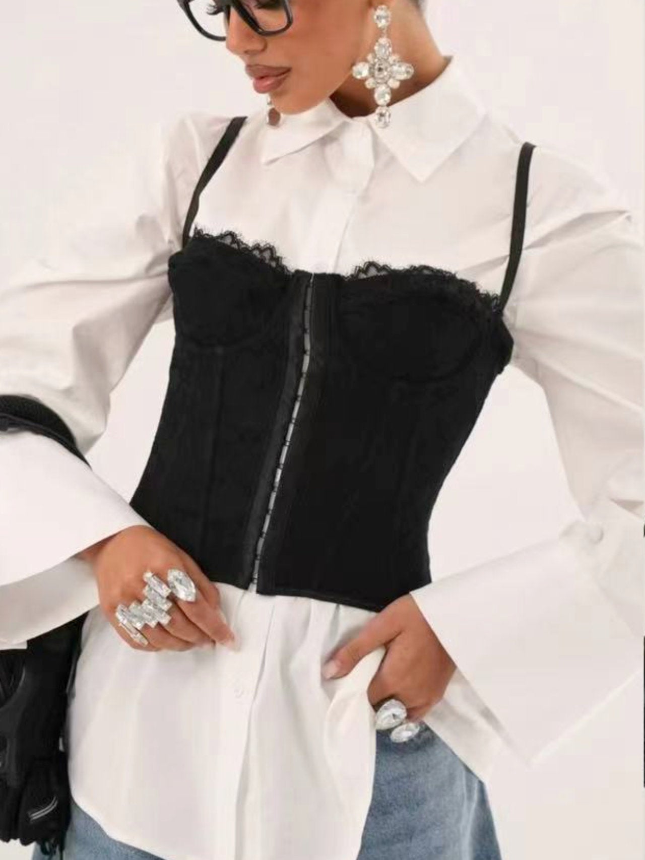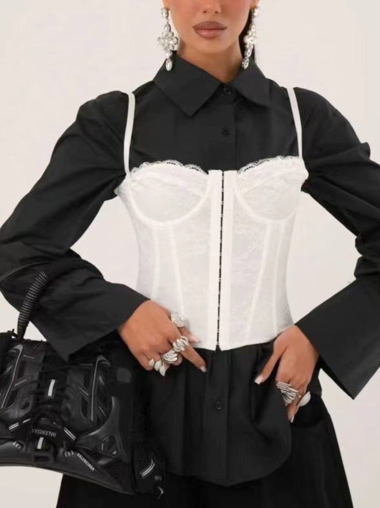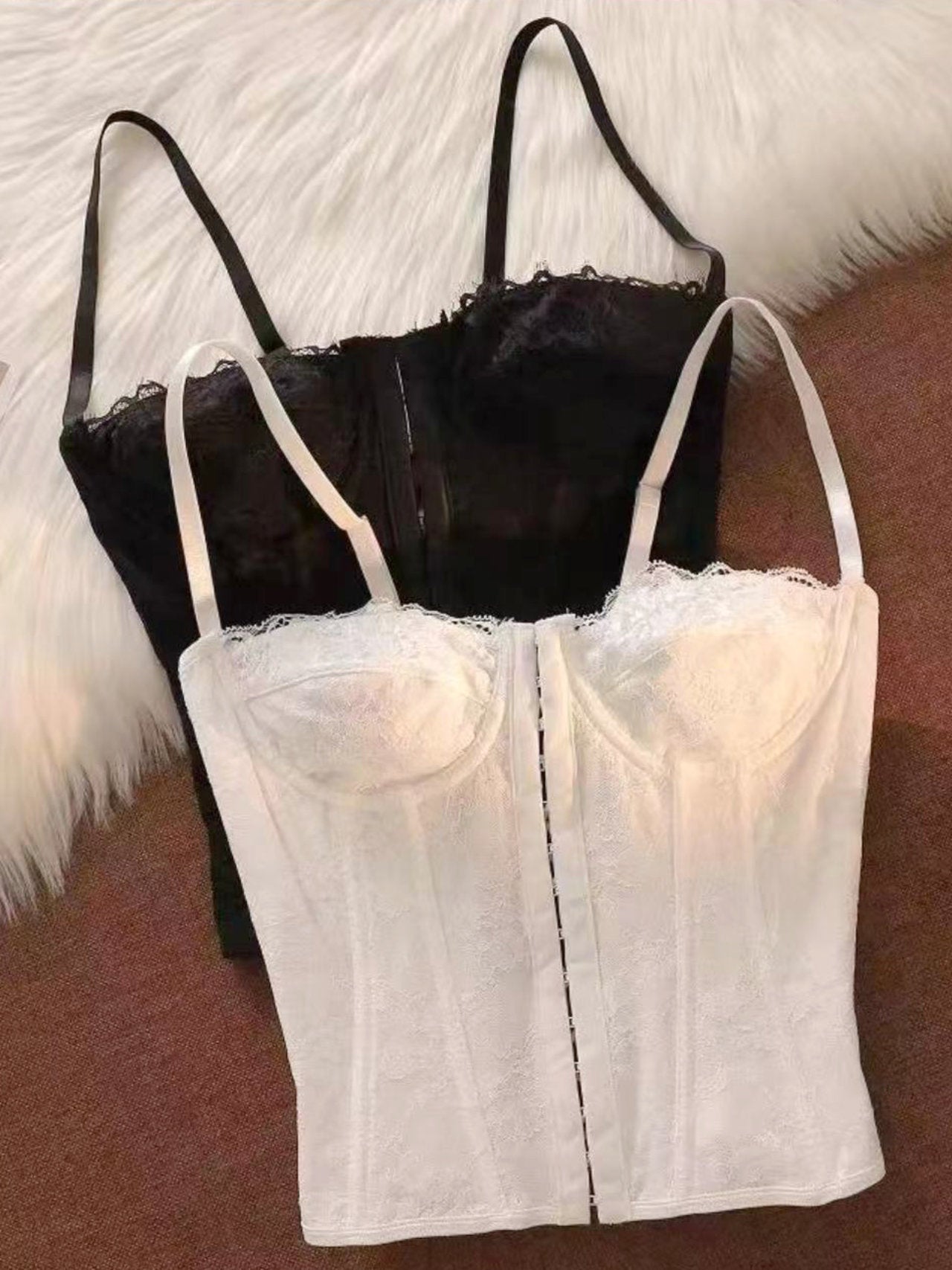 - Top a corpetto realizzato in pizzo floreale, con gancetti sul davanti e schiena scoperta con lacci intrecciati fissi, completato da sottili bretelline, ideale per un look chic e raffinato.