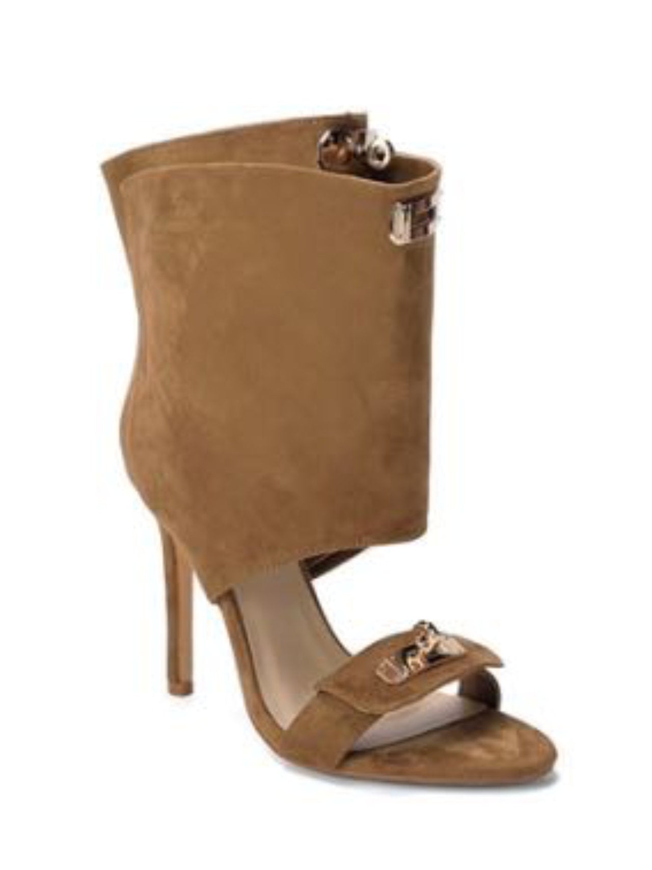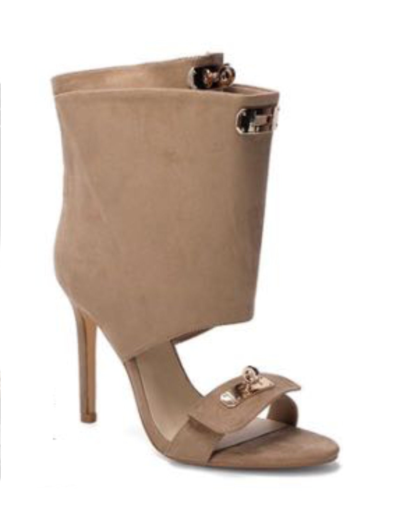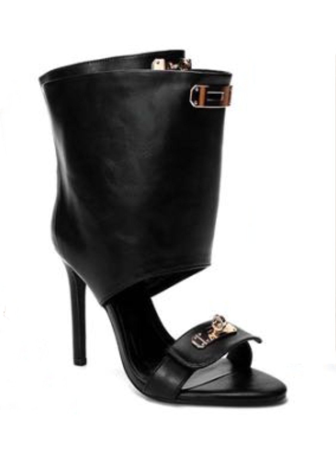 - Tronchetti a sandalo con borchie oro rettangolari e tacco a spillo che catturano l'attenzione. Design sofisticato e contemporaneo per chi vuole esprimere personalità e stile senza compromessi.