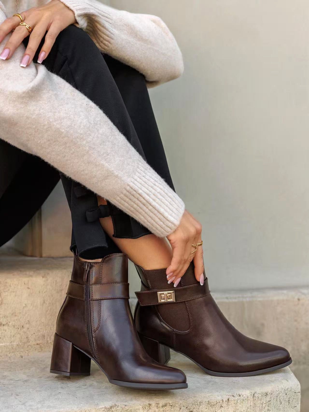 - Questi tronchetti in ecopelle con tacco robusto e fibbia decorativa sono l'accessorio che farà girare gli sguardi. Combina eleganza e audacia per un effetto che non passa inosservato.